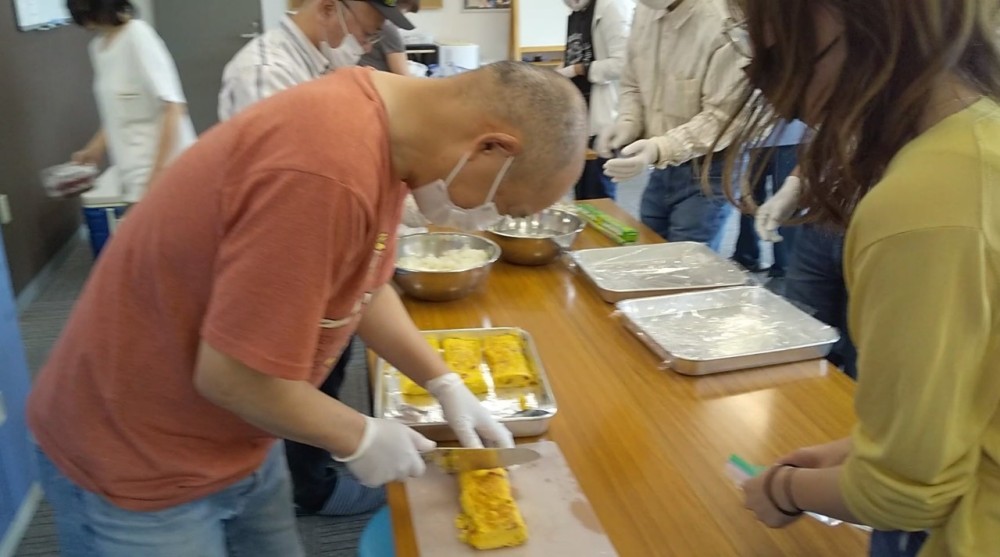 焼き上がった卵焼きを食べやすい大きさに切り分けていきます